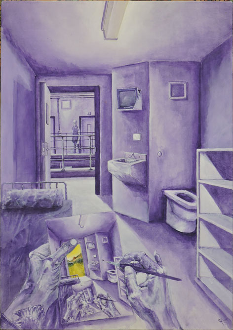 ‘I’ve drawn endless images of myself drawing myself. It speaks highly of the monotony endured within prison. This particular one I implanted the fantasy of my eventual freedom’.