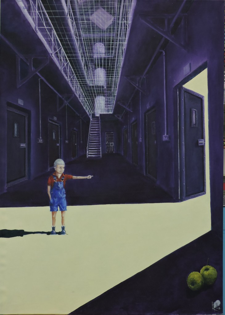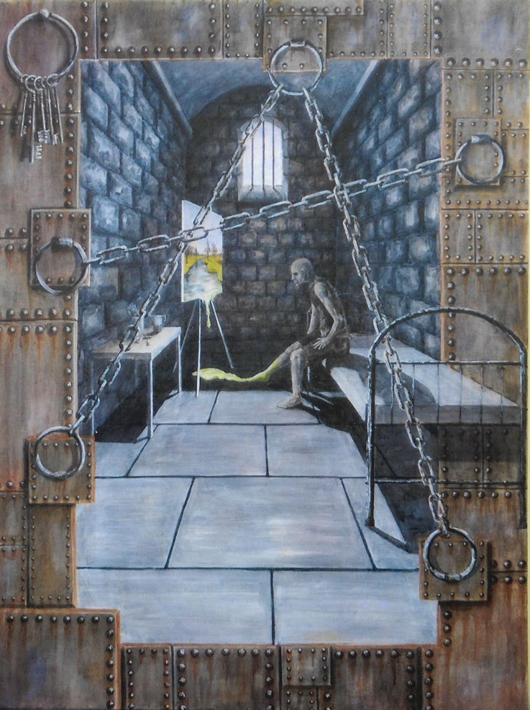 Using phthalo green and oriental violet I depicted one of the old Victorian cells in which to place my characters, the dimensions of the sepulchre type cells often leave a person with a sense of being entombed. With its high stone walls and vaulted ceilings, you could easily imagine it being a crypt, hence the ensconced skeleton as a metaphor for the ever-present death shadowing our lives. The wrapping of the cobwebs denoting the passage of time was also a doth of the cap to a rather bizarre thought I had during the midst of our lockdown. Although I was definitely feeling a little stir crazy by then after a year of being isolated in my concrete box, I hadn’t quite reached the stage of licking the windows yet. I did, however, watch a spider build a web with such tenacity and determination that it should’ve been a memorable learning curve an inspirational example of how to dig deep in times of stress and overcome adversity. Instead, I wondered what a spider’s web tasted of, yup, almost stir crazy but not quite yet. The two figures I placed upon the bunks I attempted to give a translucent look to as I wanted to capture that ethereal insubstantial feeling that often accompanies a convict’s sentence. Very rarely have I been treated as more than just a faceless number in a sea of other non-entities and in the times of covid lockdown that sense of irrelevance was compounded tenfold. Left to just get on with it with nothing more than a wing and a prayer oh, and the obligatory piss pot of course. Our only constant is the stone walls and steel doors of which those incarcerated often take on the mantel of. By that I’m referring to a person becoming cold, hardened, abrasive, inflexible, insular, so on and so forth. My figures are knocking around a toilet roll which started out as an orange to represent the complete boredom of isolation, but I felt the toilet roll was a more complete metaphor for how I was feeling. Finally, one other area of the painting I gave a little thought to was the reflecting light. Being closer to the end of the lockdown than we were from the beginning I chose to add a little light reflecting from the window. There’s only a hint on show as this particular convict still has a daily fight with his half empty glass but at least there is some light and hopefully this set back won’t go on for too much longer. And with that I shall leave you all to it. Wish you all well in your future endeavours.