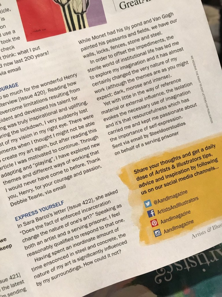 Maybe time I enter some other competitions and see how I fare amid the wider art world. There’s always that fear of failure or rejection which accompanies those thoughts for me. Is it the same for you I wonder? I’m sure its pretty much a human trait most can identify with? Even this foray into the world of websites, blogs and social media has evoked many a daunting thought of ‘what if’s’. Thankfully I have an amazing partner who’s glass is over brimming with optimism and enthusiasm whom I just can’t say no to. I recently told her of an article I’d read in Septembers issue of Artists & Illustrator magazine asking the question of how lock down impacts upon the creative approach of those already incarcerated? Her insistence I respond to this question saw me scribbling away my inner thoughts whilst all the while thinking ‘They won’t want to hear from a convict’. Low and behold Decembers issue was delivered and not only did they want to hear what a convict has to say but they actually printed it in the letters page alongside the steeldoorstudios logo. Very surreal to see it in front of me in black ‘n’ white. Maybe more to this positive thinking malarkey after all!!!
