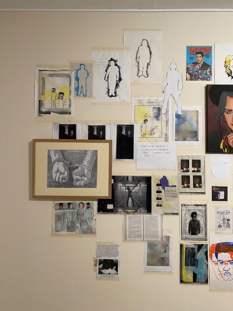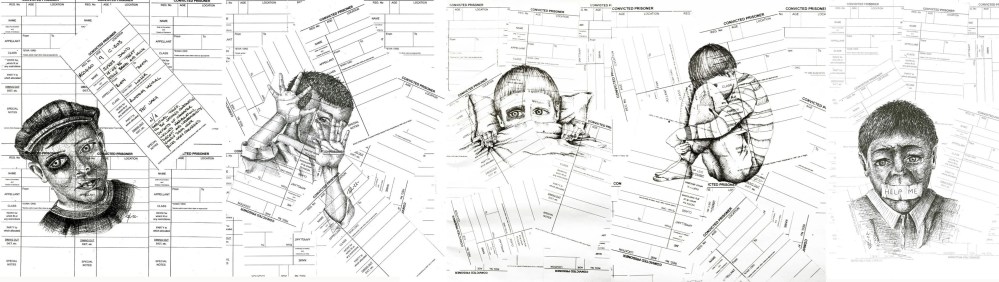 Ink on A3 paper (prison cell cards as background)