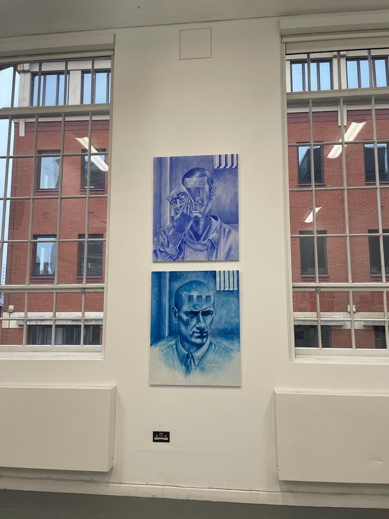 paintings convey a sense of damage, paranoia, surveillance and trauma. The