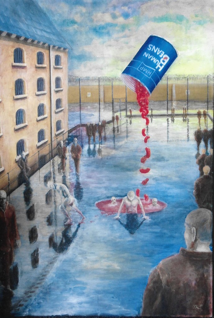 Hold tight…Acrylic on canvas 1000x750mmCode Blue 2 (end of their tether) Acrylic on canvas 1000mm x 750mm I painted this with knowledge in mind that the biggest killer of young men is suicide. I’d recently been reading one of the three monthly prison newspapers (Inside Times, Converse, Jail-mail) which contained an article relating to the stats on deaths in custody. I felt compelled to paint a hard hitting reality check to highlight what is rarely, if ever, reported to the outside world. Over the decades I’ve known numerous men who are no longer with us due to reaching the end of their tether. Mental health, for the incarcerated has taken a real turn for the worse over the past couple of decades. The lack of purposeful activity, increase in drug use and decline of the intervention services has only continued to exacerbate this problem. Propaganda… Acrylic on canvas 900×450 After glancing at one of the daily red tops (The Sun) recently, which was spewing their usual tripe designed to evoke malice and spite amid the general public. I thought I’d create this piece. Having spent years incarcerated and witnessed endless tag-lines produced by the tabloid press about how amazingly easy convicts have it whilst they are supposed to be receiving punishment. You’d think I’d be flabbergasted at the ignorance of fact they choose to employ, but the only thing that surprises me these days is that people still get surprised. What I can tell you as Fact Is I was to be removed from society as a punishment. My liberty and freedom to act independently was rescinded for a set period of time. I wasn’t SENT to prison to be Punished, I was SENT there AS a punishment. What the tabloids would have you all believe is we live a life of luxury in prison. Sixty inch TV’s, PlayStation 5s, Steak for breakfast. Absolute nonsense all of it. Prison is a miserable shit hole full of contagious toxicity and deprivation. Watch this space for the next two paintings of this intended tryptic.