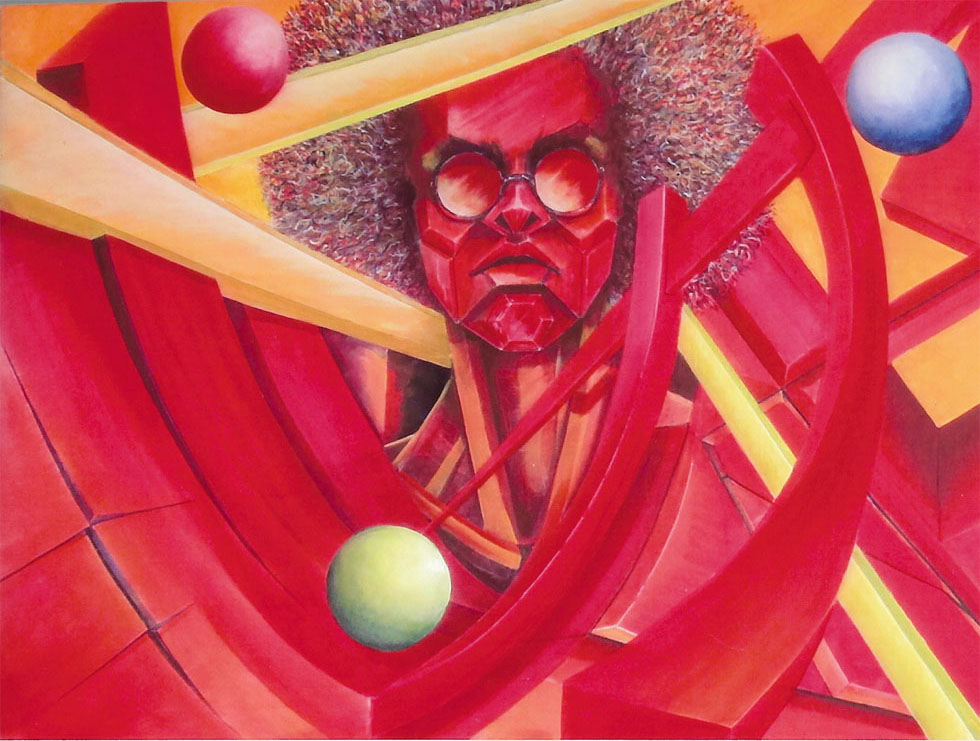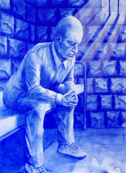 In this painting I attempted to just allow the piece to grow on its own. It spent months sitting in different positions on my cell and from time to time I would get an idea or feeling of what was needed. One really interesting aspect for me was the books as stairs, Being an advocate of the 12 step fellowship I found it fascinating that not only were there 12 books in the painting but there were also another 12 books upon which the figure was balancing precariously whilst he looked for freedom. The 12 and 12, those in the know will understand.