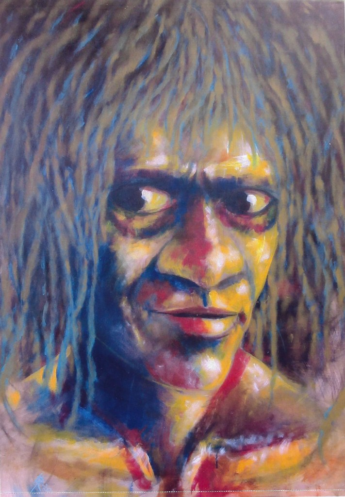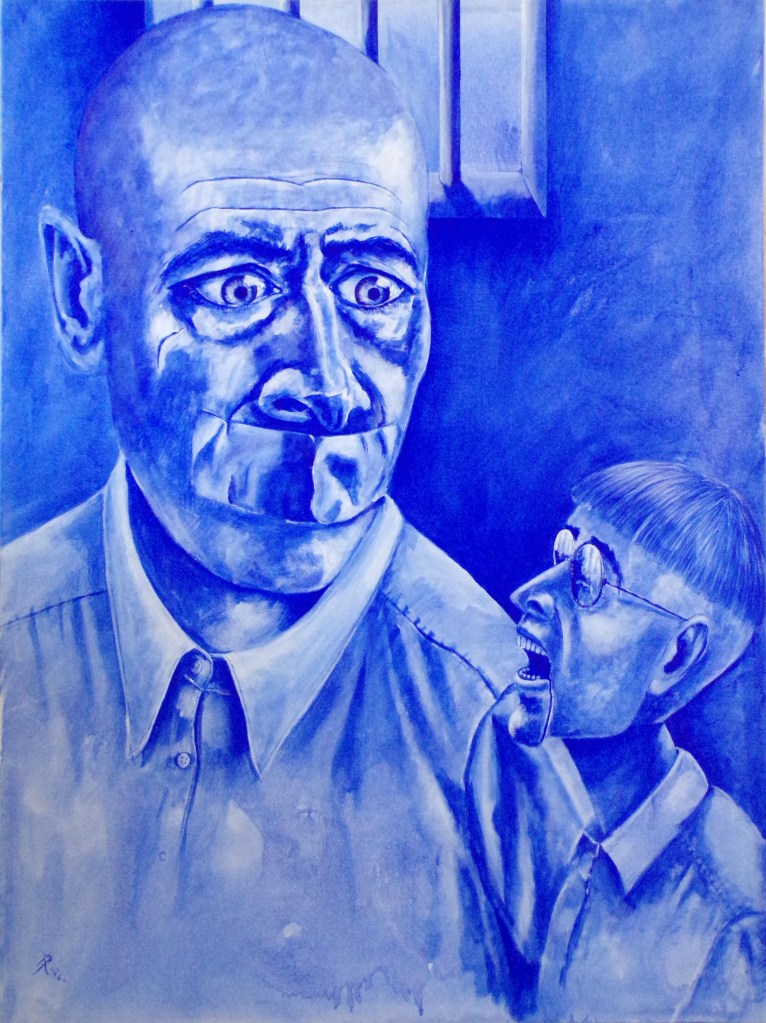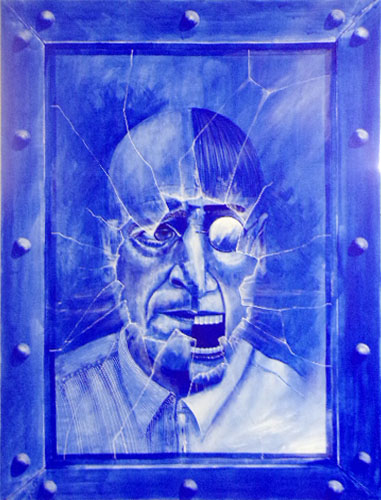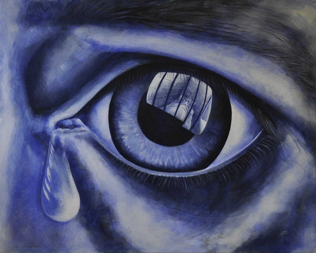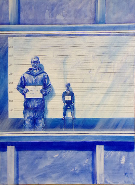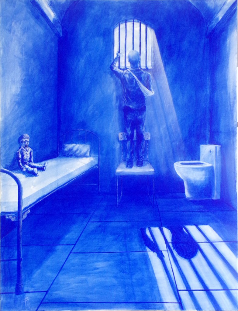Using French ultramarine to announce the feeling of coldness I created this piece as a testament to the hostile and insular environment of prison. Deliberately isolating the figure amid the dark uninviting recess doorways. I was attempting to depict the dangers of the unknown hence creating the eyes in the back of the head scenario. I used reference material from a mixed media photo that a computer whizz created for me. Showing me how to use art programs on a computer he took one of my original oil paintings of the convict in prison shirt depicting danger via eyes in the back of his head. Standing cropped it then layering it onto an image of a prison environment he overlaid the whole concept with a blue filter in homage to the convict I’d originally painted in blue. It was years before I came across a canvass big enough to encapsulate such detail and having kept the photo I proceeded to spend the next two weeks creating it anew. Big thanks to the computer whizz not for just this image but for what he also taught me about the possibilities of computers. You know who you are.