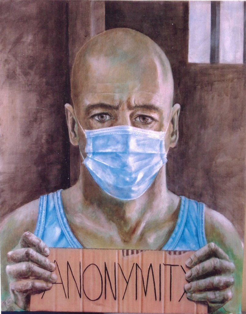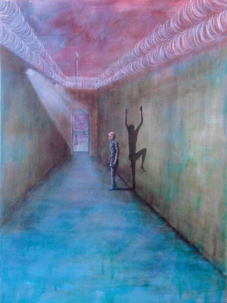 Gilt #2TurbulentTenacityAnonymity #2…Covid Times This piece was created during our lockdown of the global Covid pandemic. Roughly a year into the 16 months of only being allowed to leave my cell for 40 minutes a day I was experiencing a deep sense of abandonment and despondency. Having no reference to material other than pieces previously painted I was looking at anonymity 1 which I’d painted for an individual who identified himself as an alcoholic. Given the sense of isolation I was currently feeling that particular painting now took on a whole new meaning. Recreating it with the sitter wearing a mask whilst in an incarcerated setting captured exactly how I felt. Completely anonymous. At Odds….Free Spirit… This piece began life as a line and wash, as is the case for some of my paintings. It’s simplistic enough in its concept, the desire to be free is a constant bedfellow for me. I’ve set the scene in one of the segregation exercise yards where the intensity of incarceration is felt even more acutely than normal. Known as Seg, block, chokey or, more recently, CSU (care and separation unit) it’s essentially a punishment block. I’ve spent an inordinate amount of time in these units and I can tell you, ‘care’, don’t come into it. I felt painting the shadow attempting to escape spoke volumes whilst also adding a little humour to a bleak environment. The walls are closing in (Photo)