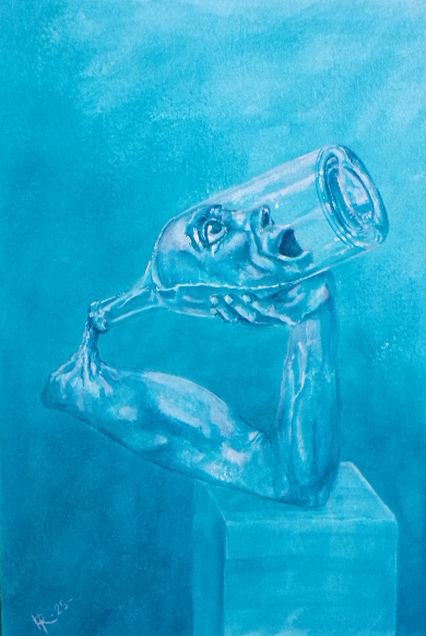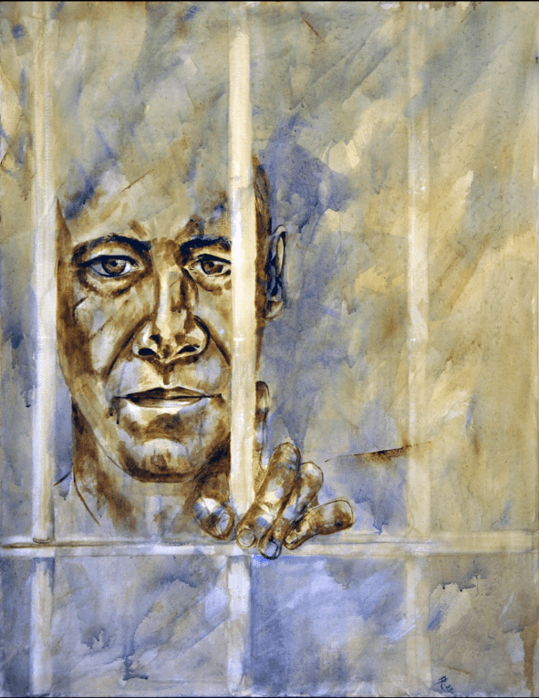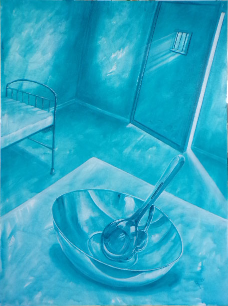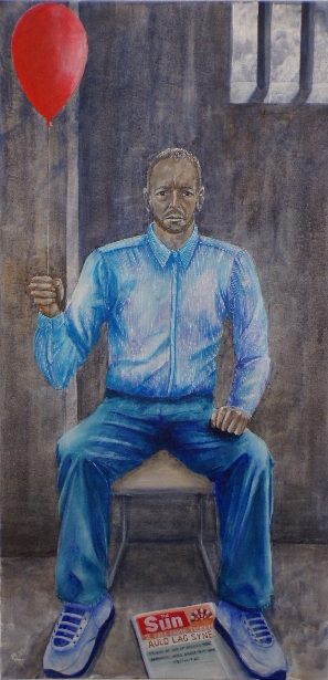 Another piece created during Covid lockdown. Having to endure being removed from society as punishment for our crimes is difficult enough but Covid lockdown was something completely new. Obviously we are used to being locked in a cell, so nothing out of the ordinary for a convict there, but for you, the general public, having your liberty revoked was indeed something new and, dare I say it, traumatic for some if not most. Due to pandemic conditions, we now found ourselves locked in cells for over 23hours a day with 40 minutes out for showers and exercise being standard across the whole prison estate. This went on for 16 full months before we saw any change by way of alleviation. As a prisoner it felt like my particular cage had become even smaller, so I painted a figure crushed into a bird cage ensconced in a cell.