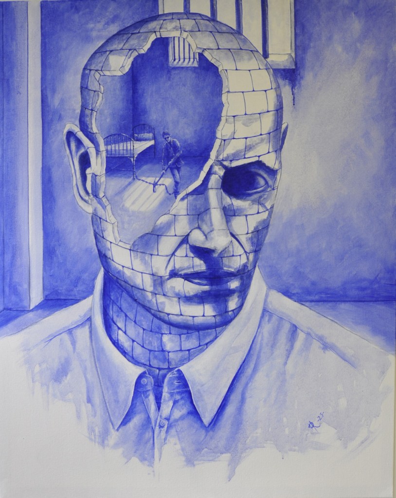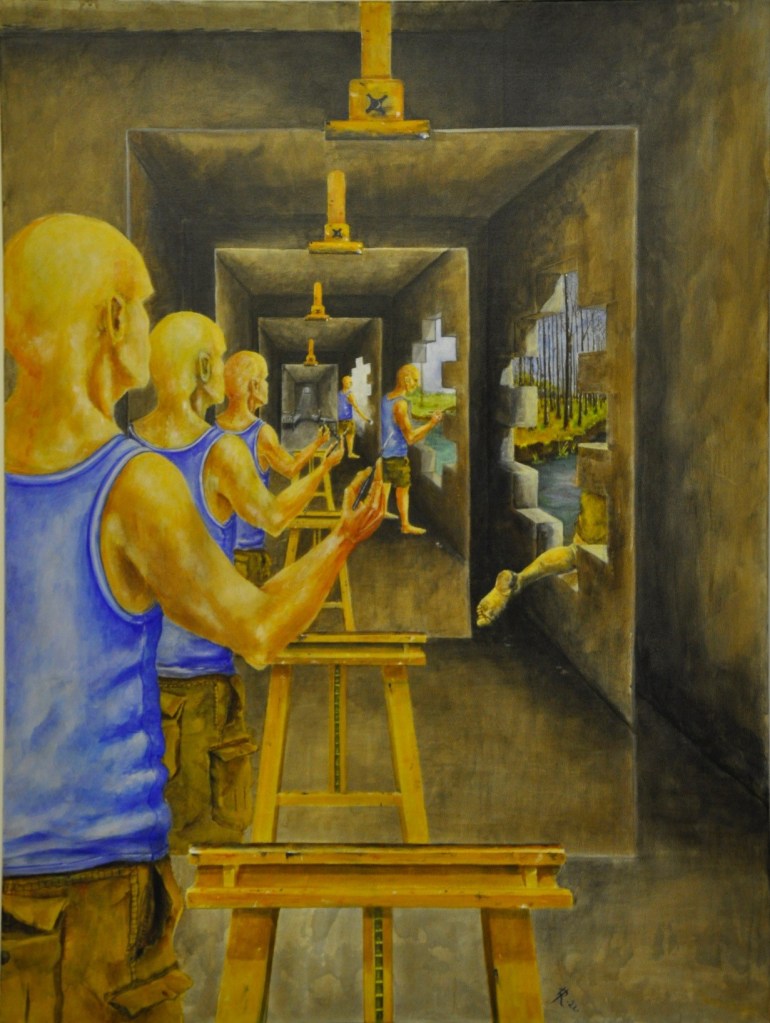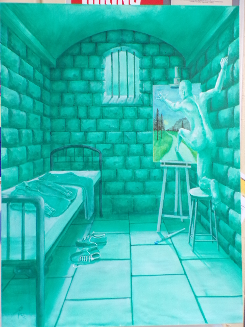 I’ve tried numerous ways over the years to depict the repetitive nature of imprisonment, sometimes with a great deal of success, others not so much so. This piece is one of those I didn’t quite manage to nail. It definitely started out as an interesting concept, a self portrait of myself painting myself, painting myself, painting the interior of a cell whilst a character to the right was priming, painting and executing a hole in the wall from which his art could offer the solace of escapism. Unfortunately upon completion it felt far too busy to me and seemed only to create confusion for the viewer. I suppose chaos and confusion could be deemed as a fair representation of incarceration but it wasn’t something that I had intended. But, as it wasn’t something that I had intended, I was left with a sense of disappointment with the finished piece. Maybe I’ll go back to the concept one day and alter it, who knows.