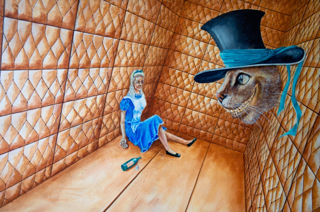 Painted in response to a short film being made by award winning writer and artist Denis Harrison. The script has an interesting take on the original storey. Denis depicts Alice as an alcoholic debating the very nature of insanity with the Cheshire cat. Despite Alice’s professing her sanity, the argument is concluded by the cat declaring “if you wasn’t mad you wouldn’t be here”