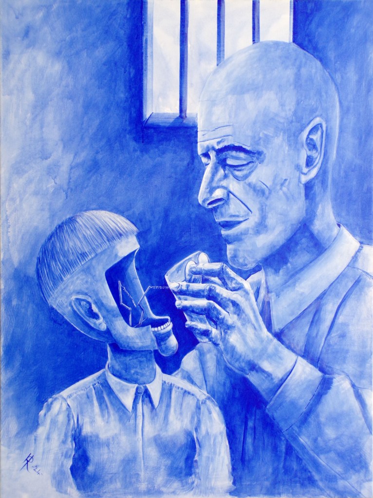 Finding myself accidentally falling into painting what’s become a series of work based upon my historic angst I’m finding it quite cathartic and liberating sharing so openly my vulnerabilities. Having spent a lifetime avoiding the questions from authoritarians regarding my history I would rigidly adhere to the same script almost as if it was a mantra. Reiterating only those known parts of my life which had already been documented since childhood. It went like this… Had a crap upbringing, then placed into the care of local authorities aged 11, first imprisoned aged 15, introduced and became addicted to narcotics in my formative years. In and out of prison until aged 27 upon when I had taken a life of an innocent man. I was incarcerated and sentenced to life imprisonment, such a narrow narrative of avoidance. Having been in a therapeutic environment for almost 5 years now I’ve found the strength to acknowledge that my feelings begin with acknowledgment of the truth and acceptance that although I can’t alter the past, I can assure the future is no longer tainted by its toxicity. This piece represents my incarceration as a child in bedrooms long before I experienced imprisonment of other types. The hardened stone exterior has given way to love and liberty for that lost little blue boy and how he’s finally begun to find the peace he so desperately sought.
