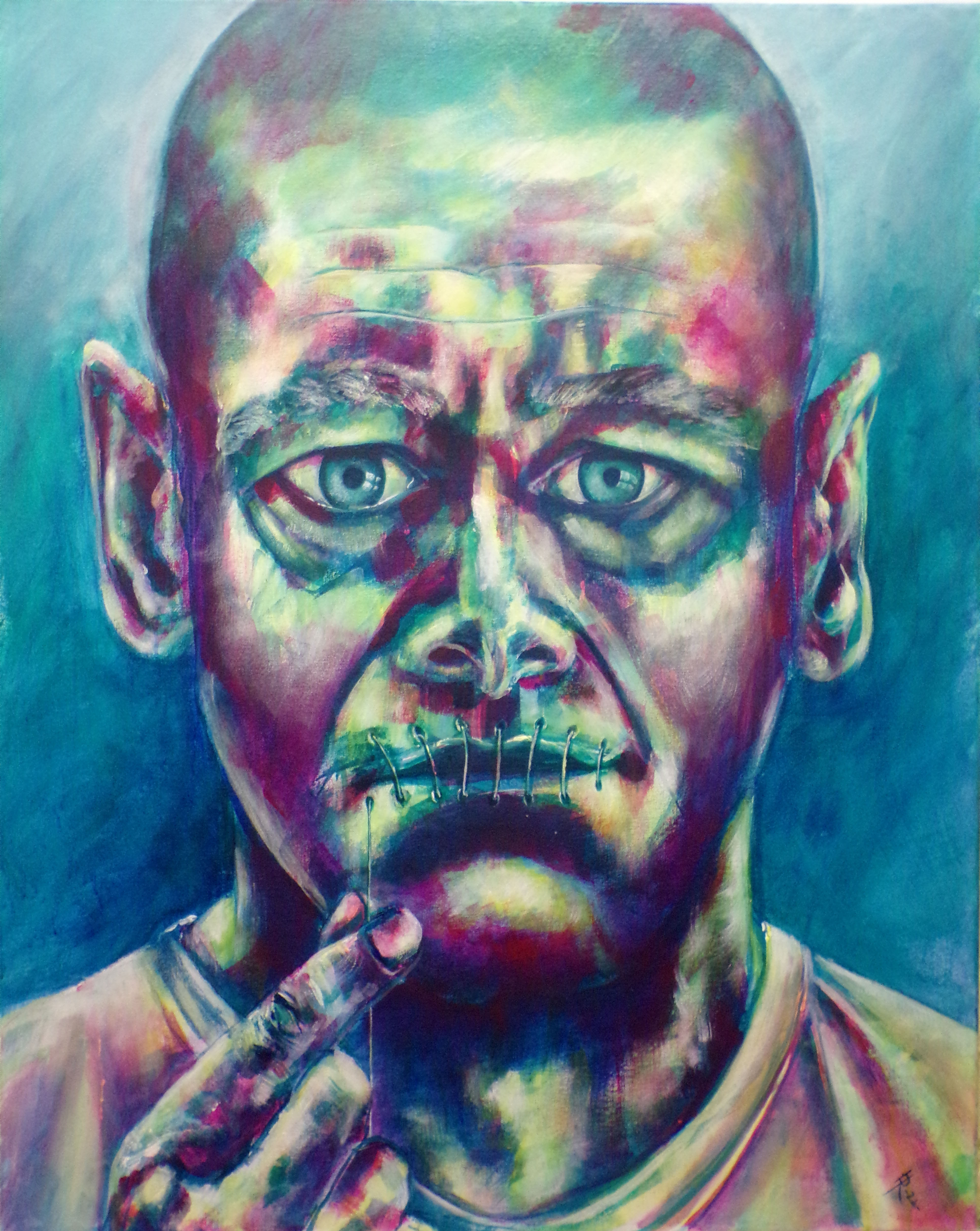 Having been the subject of recall myself I can fully identify with the abject feeling of failure which can, if allowed to fester, grow into a debilitating and toxic spiral of self destruction. Due to today’s political climate the practice of recall is par for the course and not liable to change any time soon. So rather than get out the soapbox and rant at a failing system, I chose to remember what it felt like as I walked back inside those dreaded walls, dejected, stripped bare of any self esteem, broken and powerless. The stench hits me in full the face, it leaches out of the wall with a stink of the 1000’s that went before me, the institutional smell of failure. A barely susceptible nod of acknowledgement from the haunted figure standing opposite me, eyes darkened from stress, body slumped from the weight of oppression. Looking around the holding cell at the multitudes of zombiesque figures, mostly addicts in different stages of withdrawal, crammed in like sardines waiting for the processing to begin. Only a few short months ago I was sat in a similar reception waiting for the process of release to begin. Only then there were just 4 of us and the difference was palpable. Every man had such high hopes, I stood 20 feet tall with such confidence, I’d managed to get through a life sentence, almost 18 years, my future looked bright and certain. I painted this piece so I would remember what awaited me if I don’t take off that institutional uniform of failure.