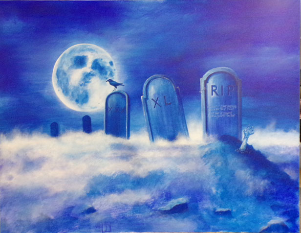 The final piece in this series left me feeling weary and wary. The burial of Sykes (my alto ego dummy) afforded me a sense of relief in his internment, yet the need to depict the zombie-esque arm reaching from beyond the grave was paramount as a reminder to acknowledge that my defects of character remain within touching distance without maintenance. The five headstones are representative of my five decades, with the third being the most destructive and tumultuous, hence the dark entity often associated with rooks, ravens and crows.The Journey Begins… acrylic on canvas 400x300mm
