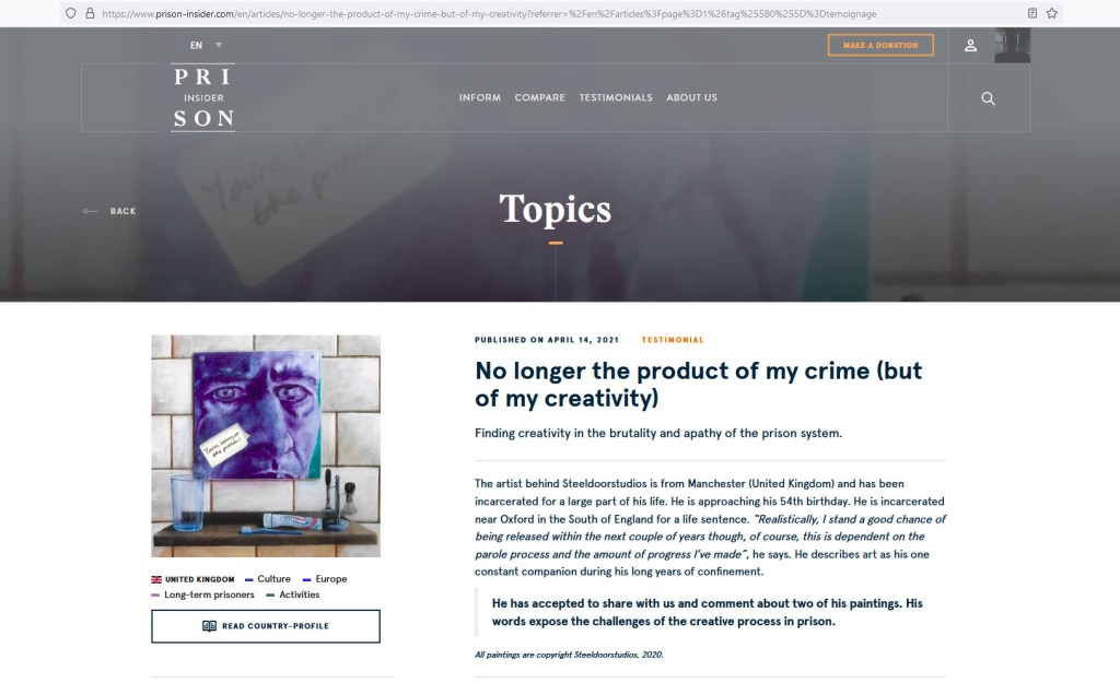 Le site « Prison Insider » a récemment donné la parole à l’animateur du site Steeldoorstudios (les studios des portes en acier). Âgé de près de 54 ans, il a passé de nombreuses années en prison. Étant daltonien, il pensait la peinture inaccessible pour lui et n’y est venu que tardivement. Il mesure la chance d’être incarcéré dans une prison qui favorise l’expression artistique « surtout tout au long de cette pandémie où nous avons passé une quantité excessive de temps enfermés dans nos minuscules boîtes de béton. »